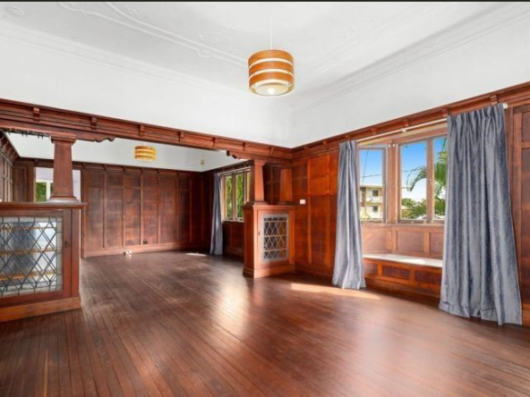 Toohey is a rare and impressive Queenslander that embodies authentic period craftsmanship, distinguished by its silky oak wall panelling, ornate detailing, leadlight display cabinetry and dual bay windows.